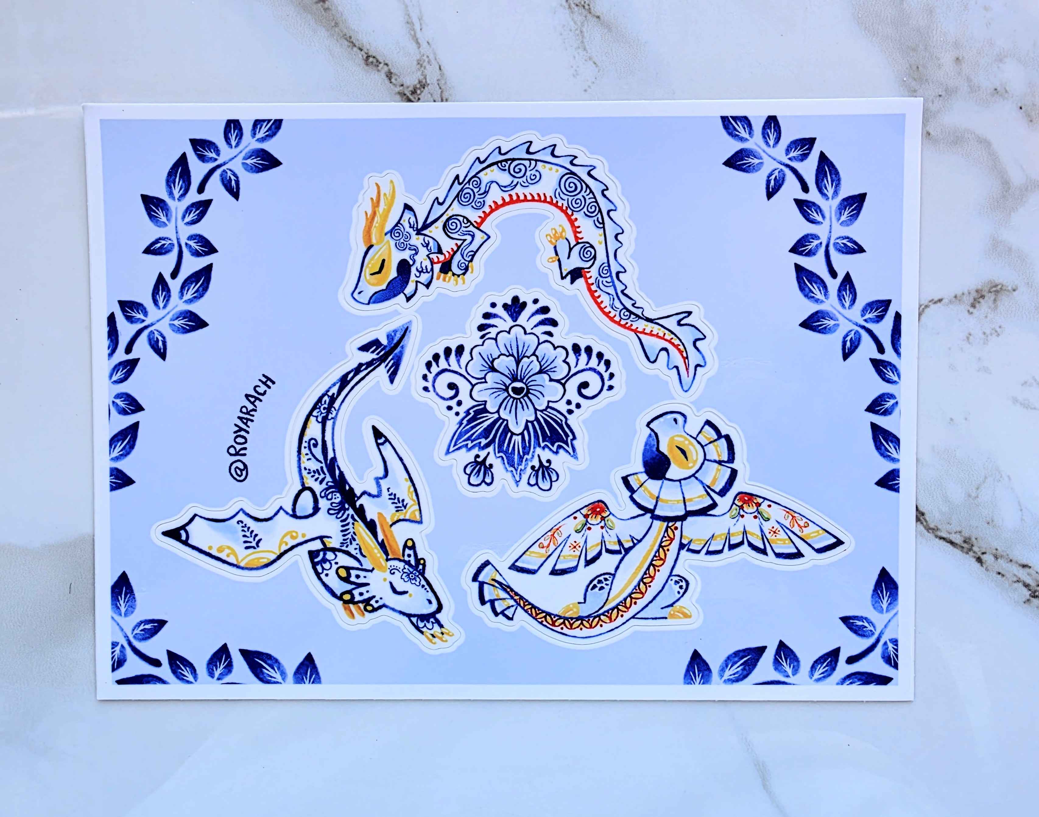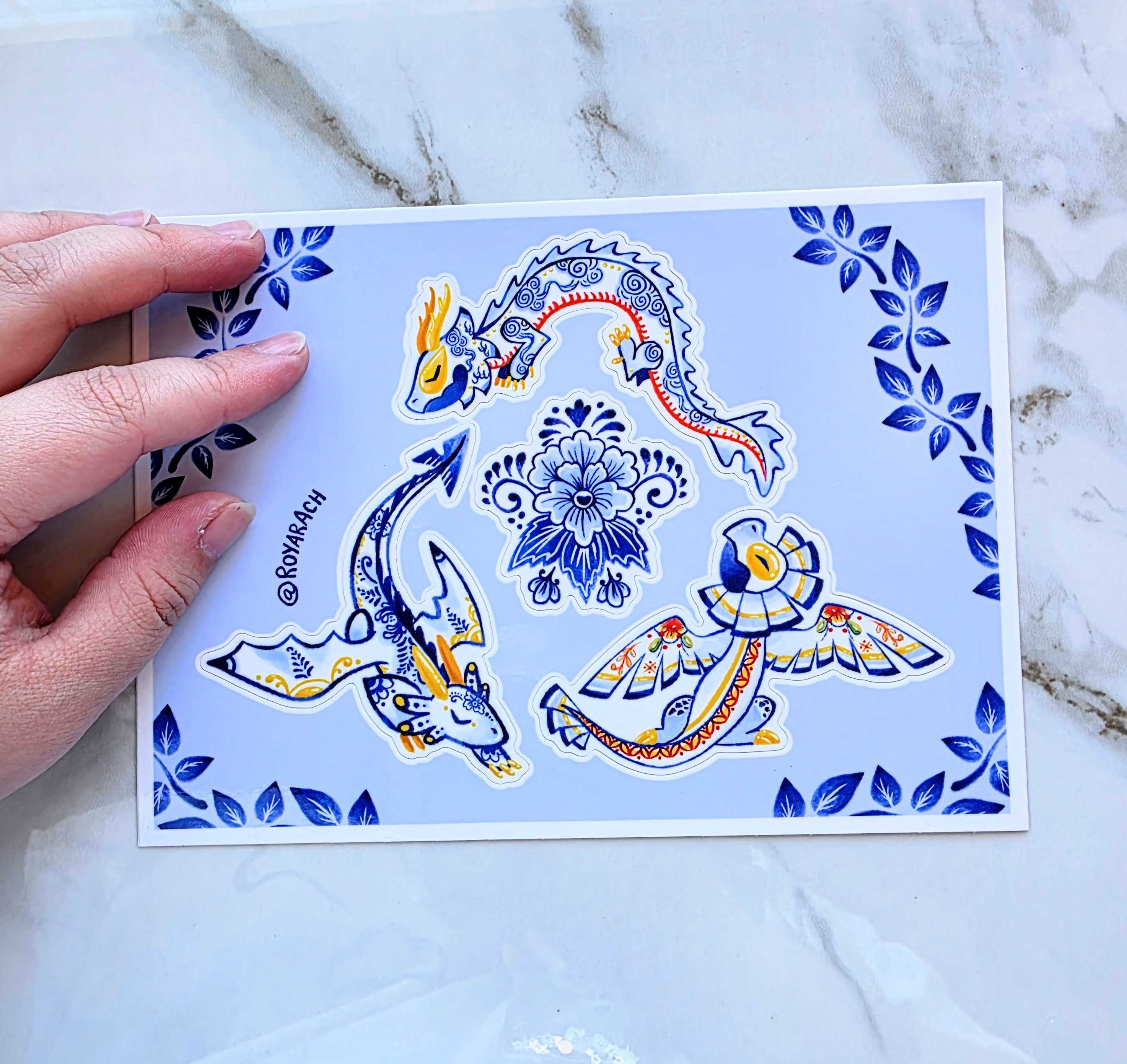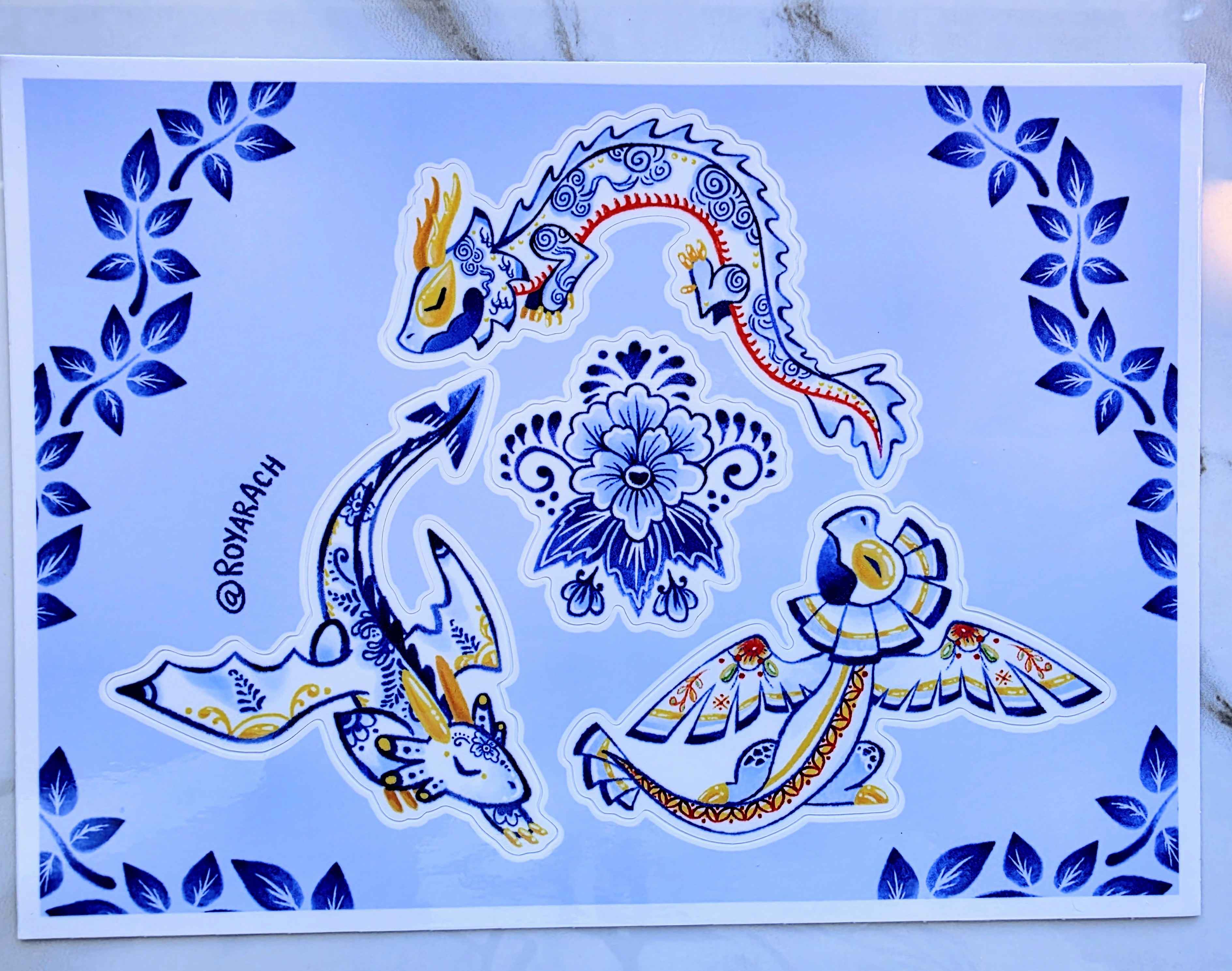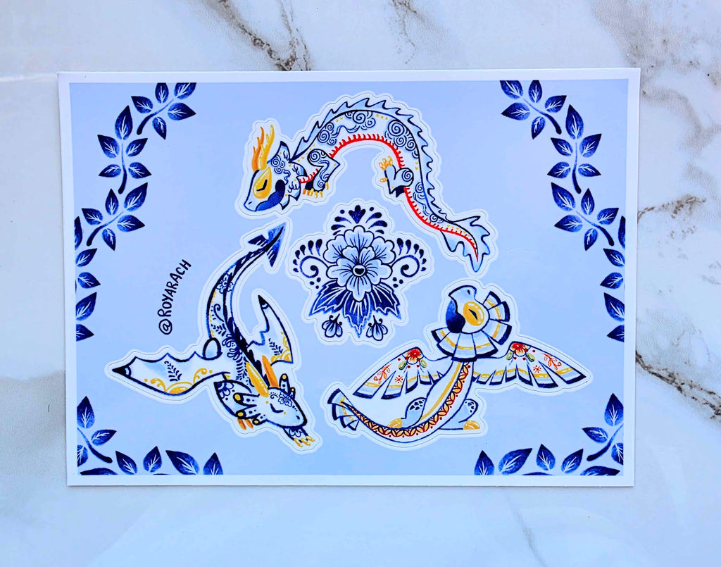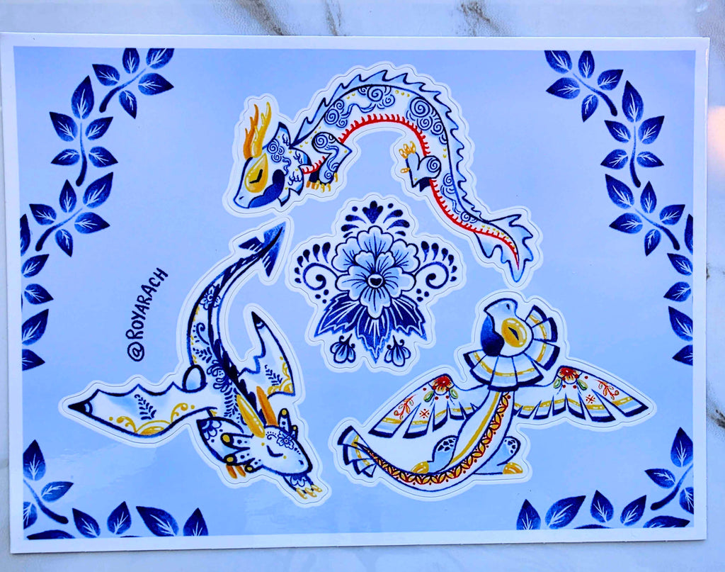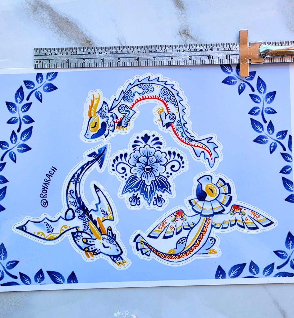 Weatherproof 5xy inch vinyl sticker sheet of my porcelain dragon designs. There are 4 stickers per sheet. Stickers are UV proof for around 2 or more years.