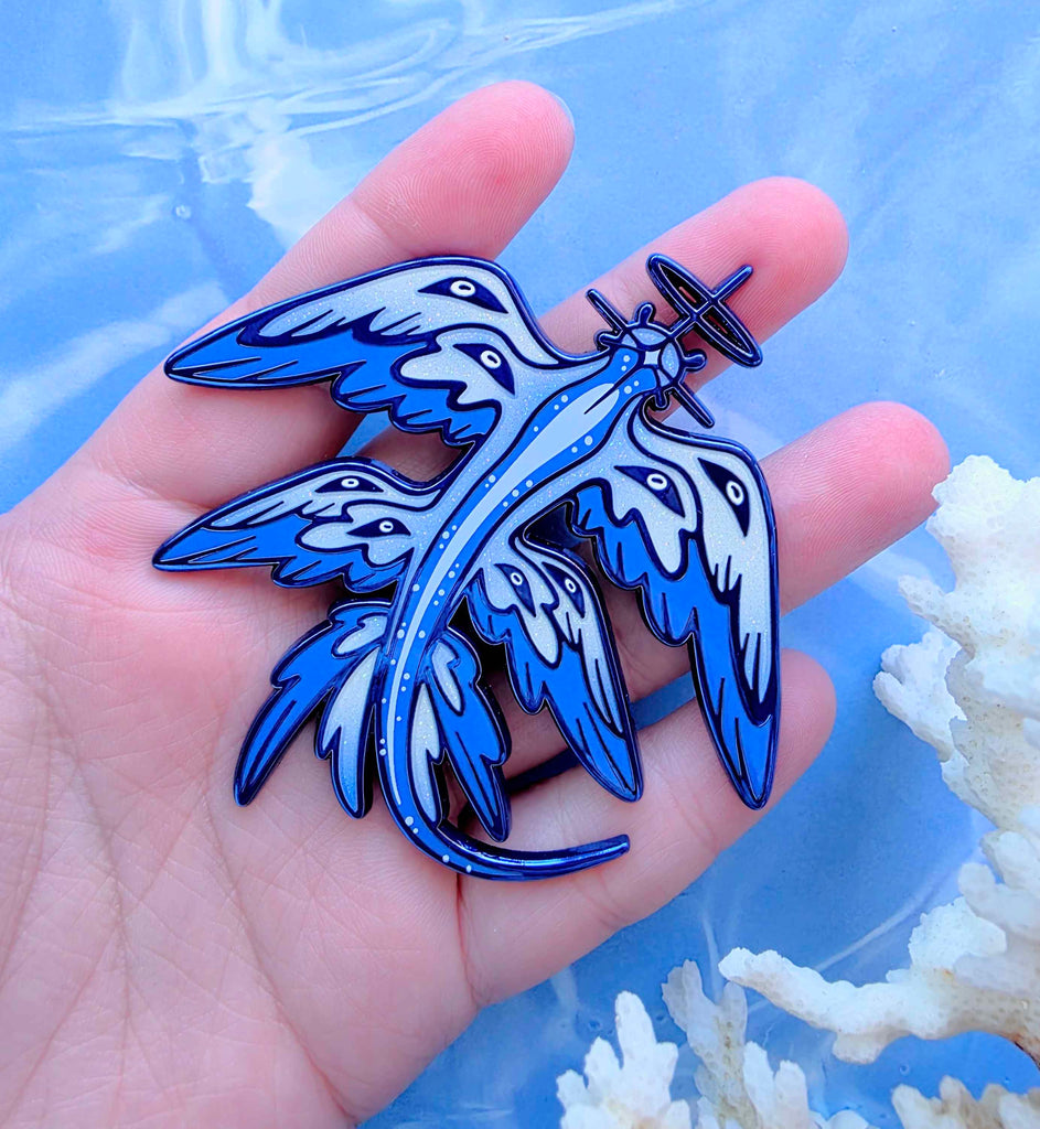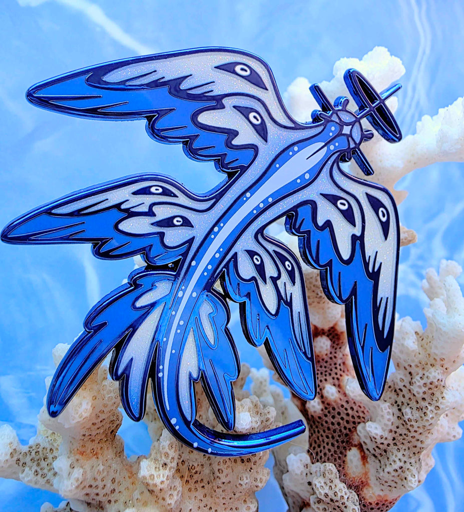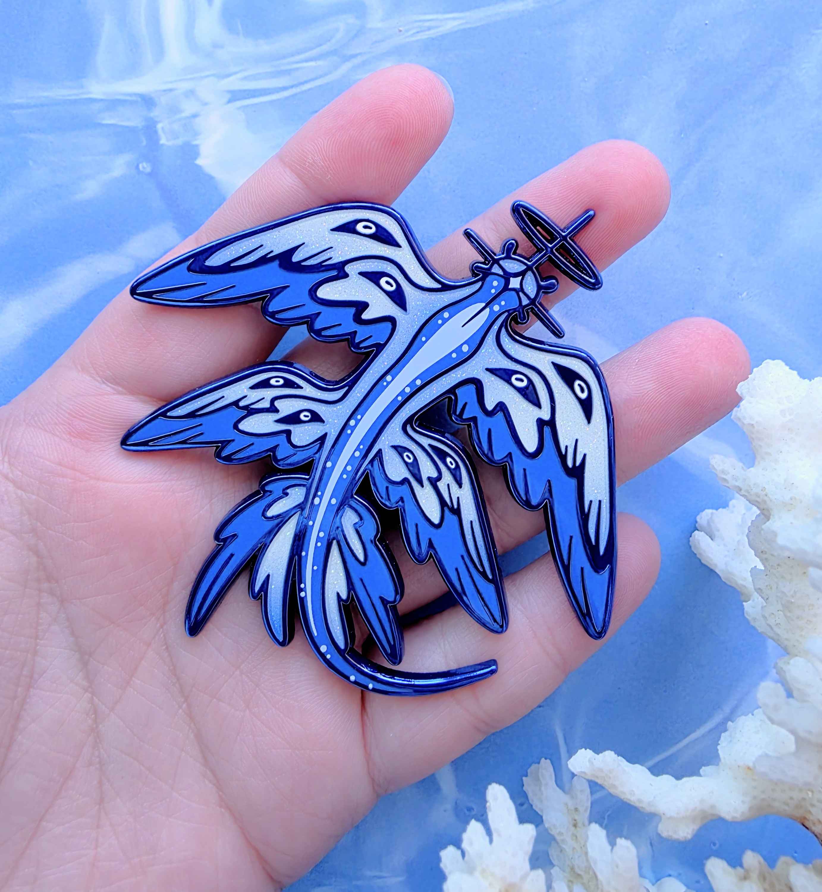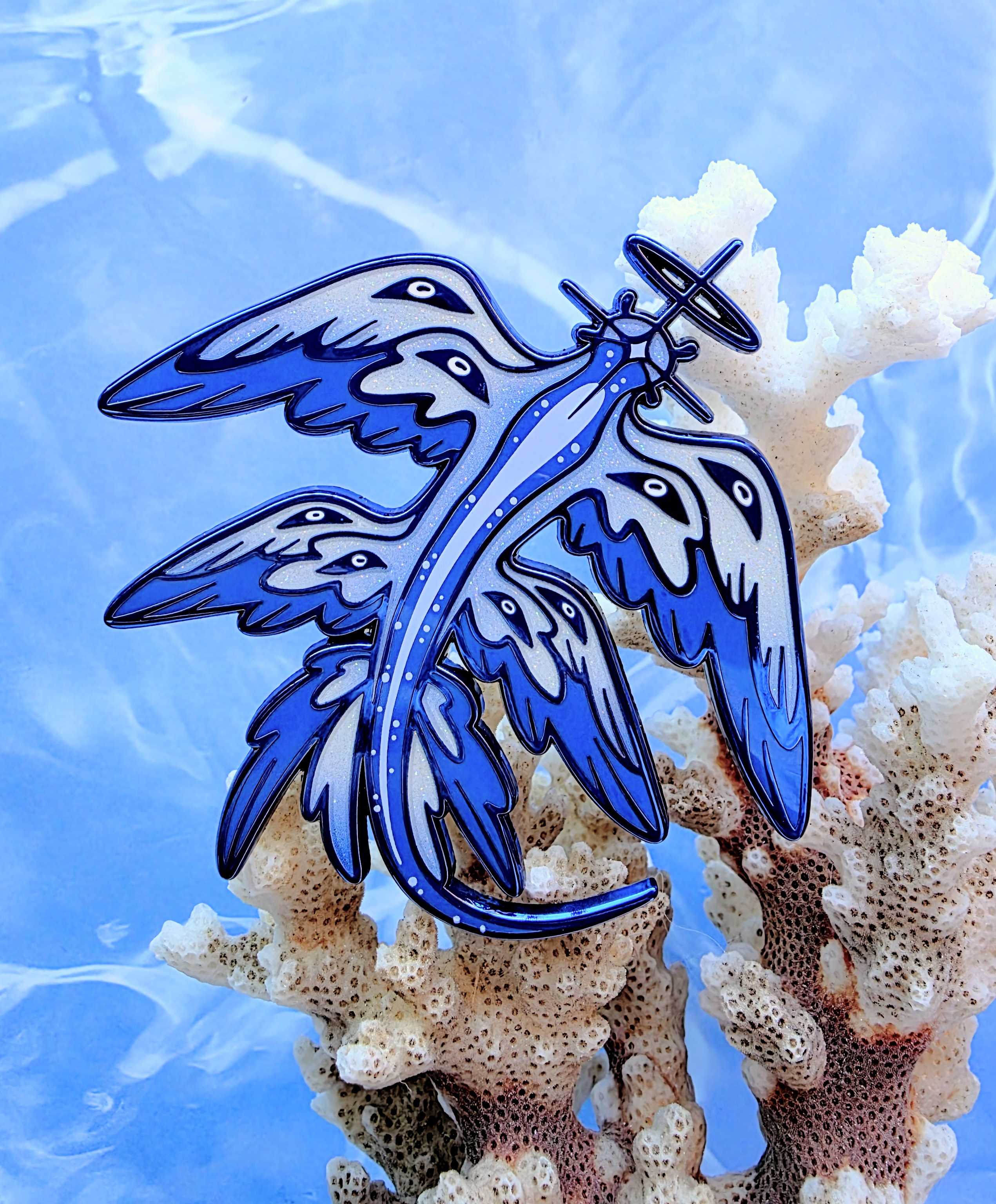 2.5 inch blue chrome hard enamel pins of my angelic blue dragon nudibranch design. Features glitter gradients and screen printing.