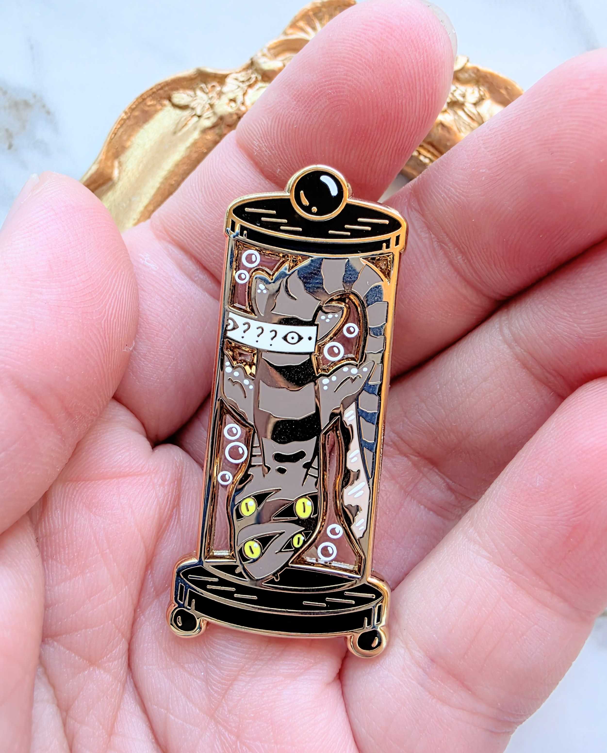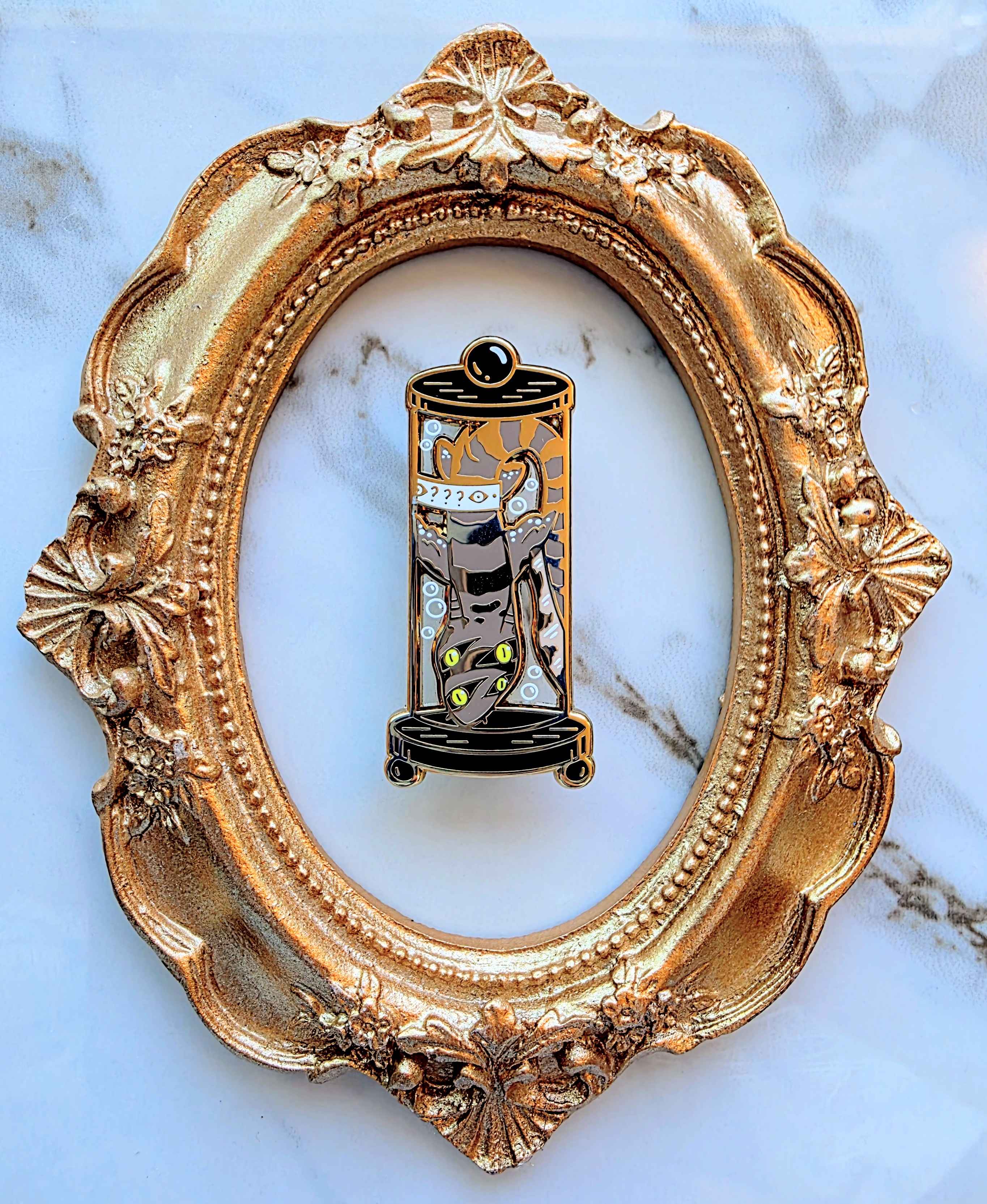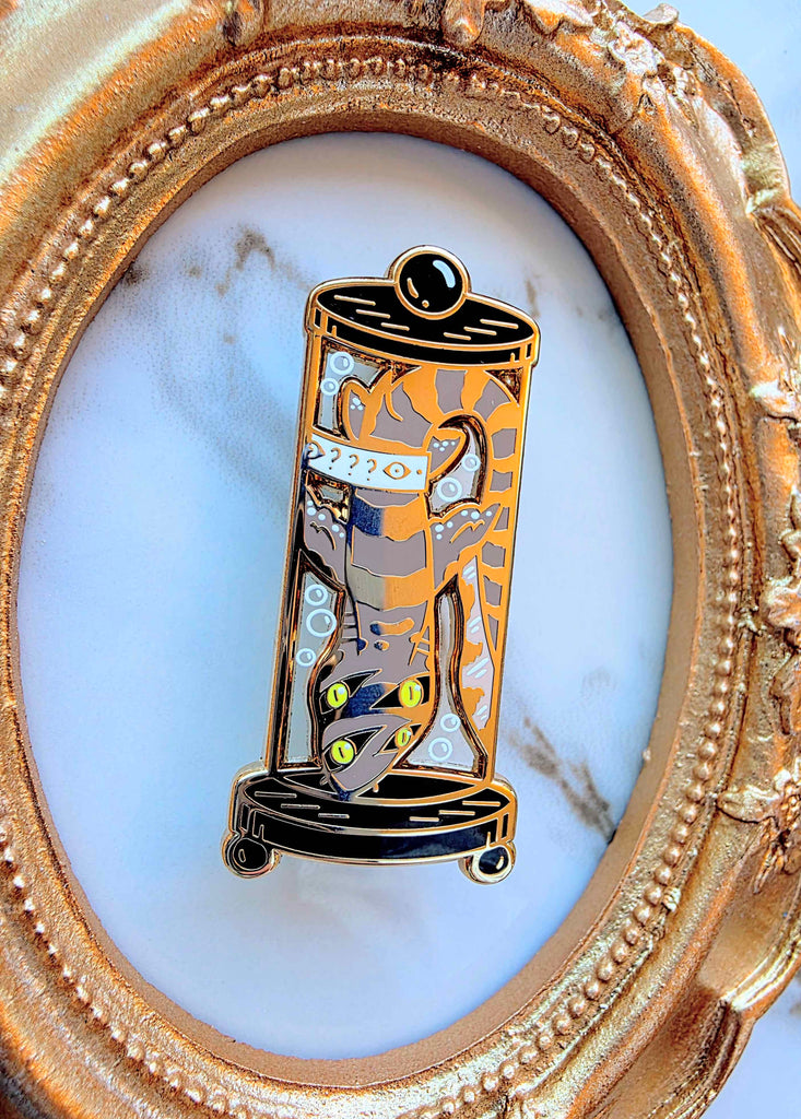 1.7 inch gold hard enamel pin inspired by my own cabinet of curiosities. Based off of a bamboo shark wet specimen. This pin features a "stained glass" epoxy effect. Comes with 2 rubber clutches.