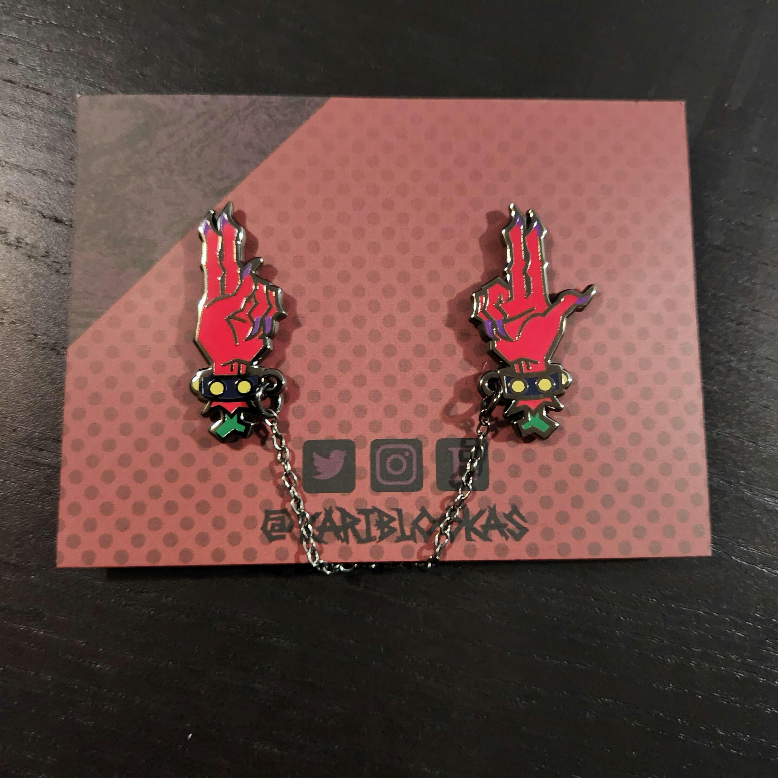 1.5 inch Hard enamel pins of an original design of a pair of demon hands. Comes with 2 rubber backings for each hand and a 3 inch chain in between. Designed by Kariblookas