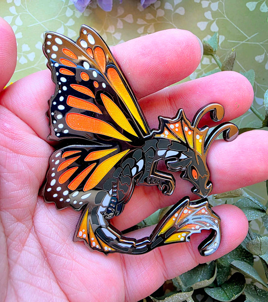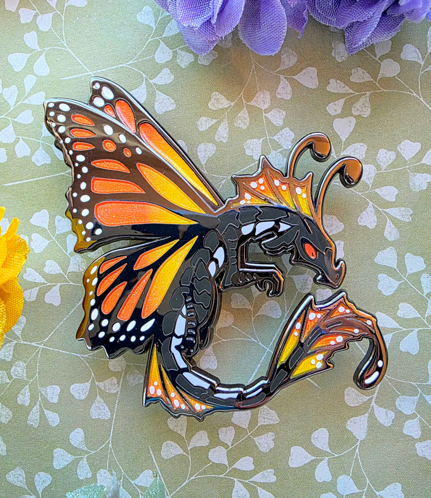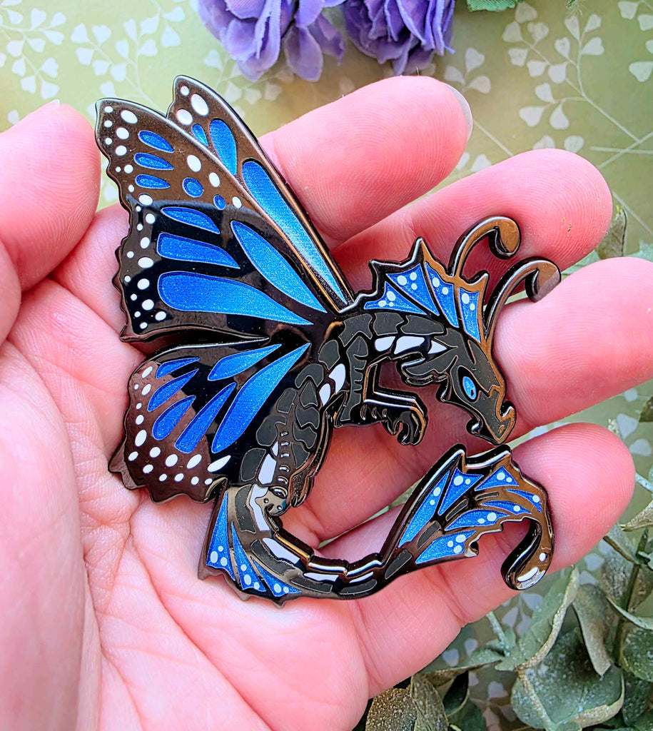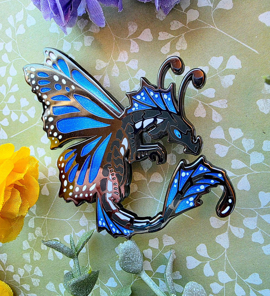 2.5 black nickle hard enamel pins of my fae dragon design. Comes as either a Monarch butterfly, or a Blue Morpho Butterfly. Both feature glitter gradient wings!