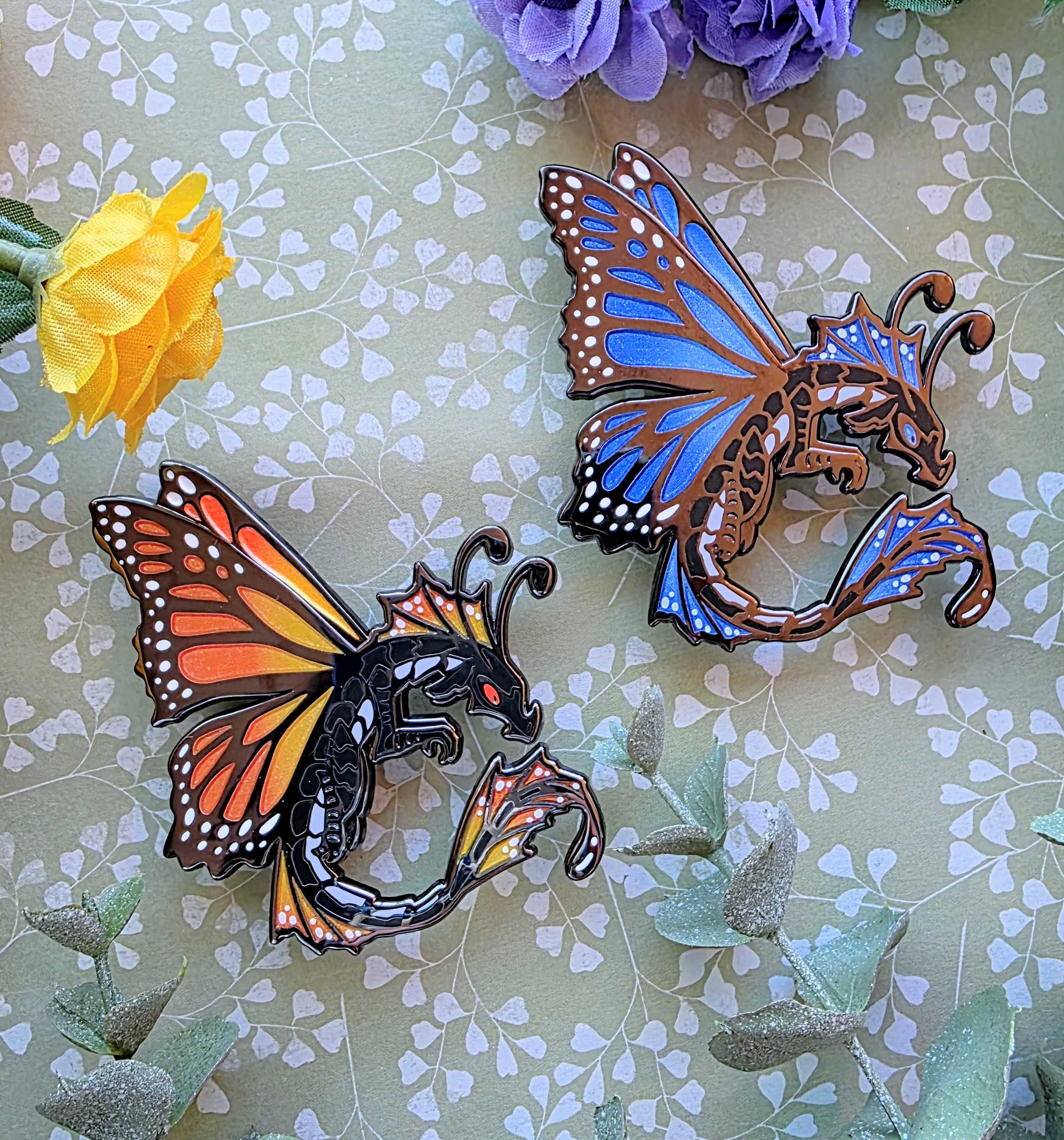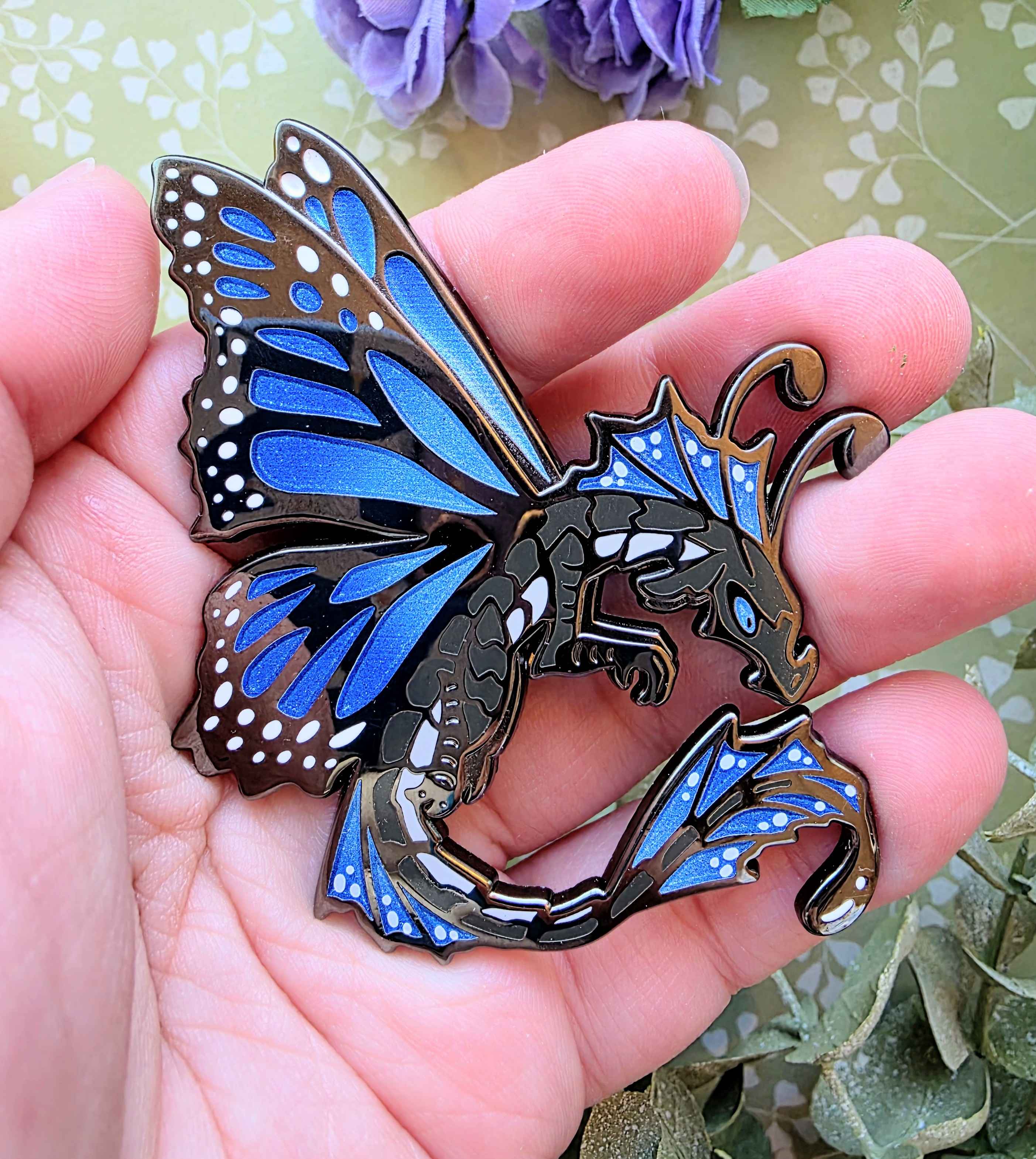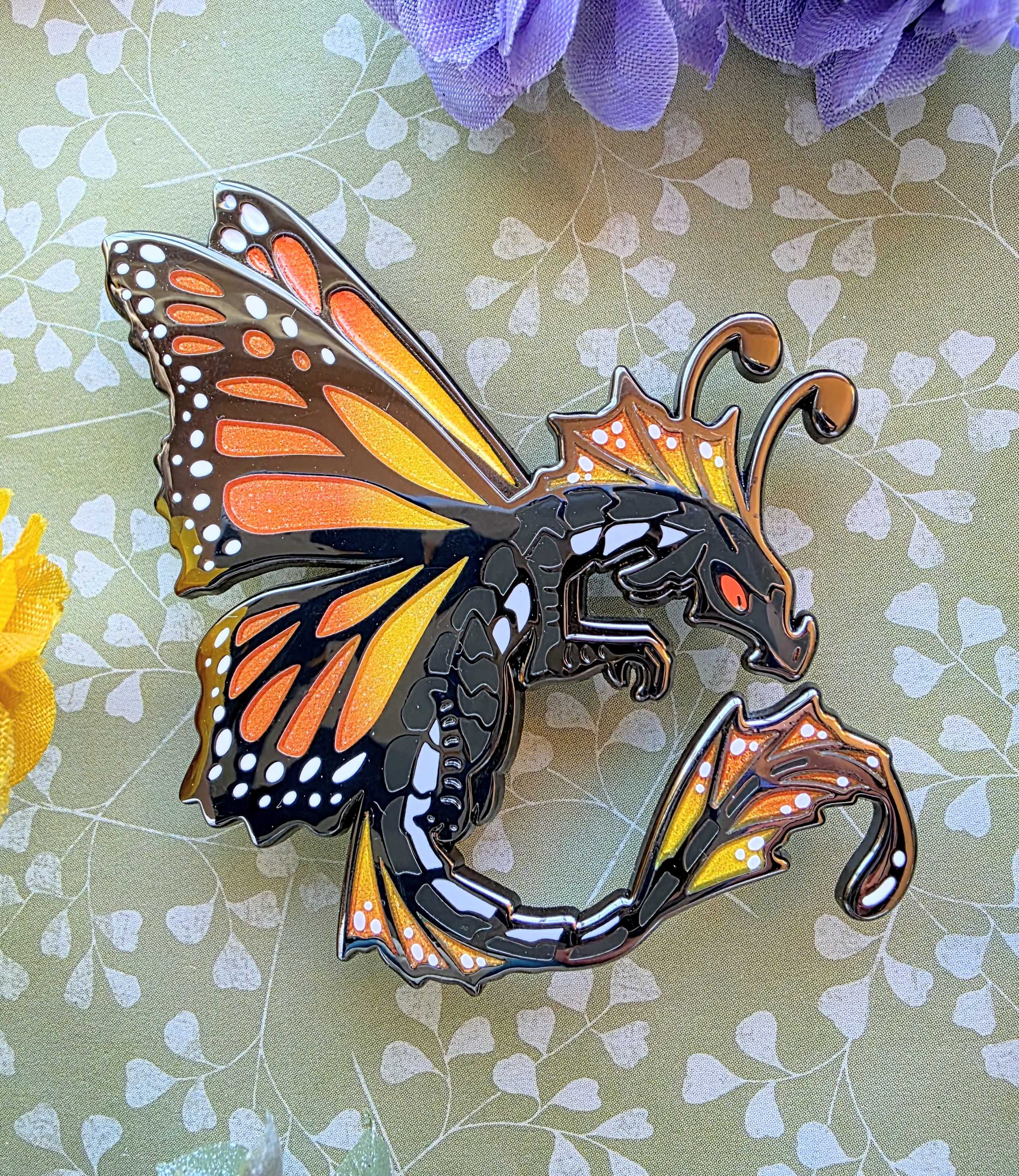 2.5 black nickle hard enamel pins of my fae dragon design. Comes as either a Monarch butterfly, or a Blue Morpho Butterfly. Both feature glitter gradient wings!