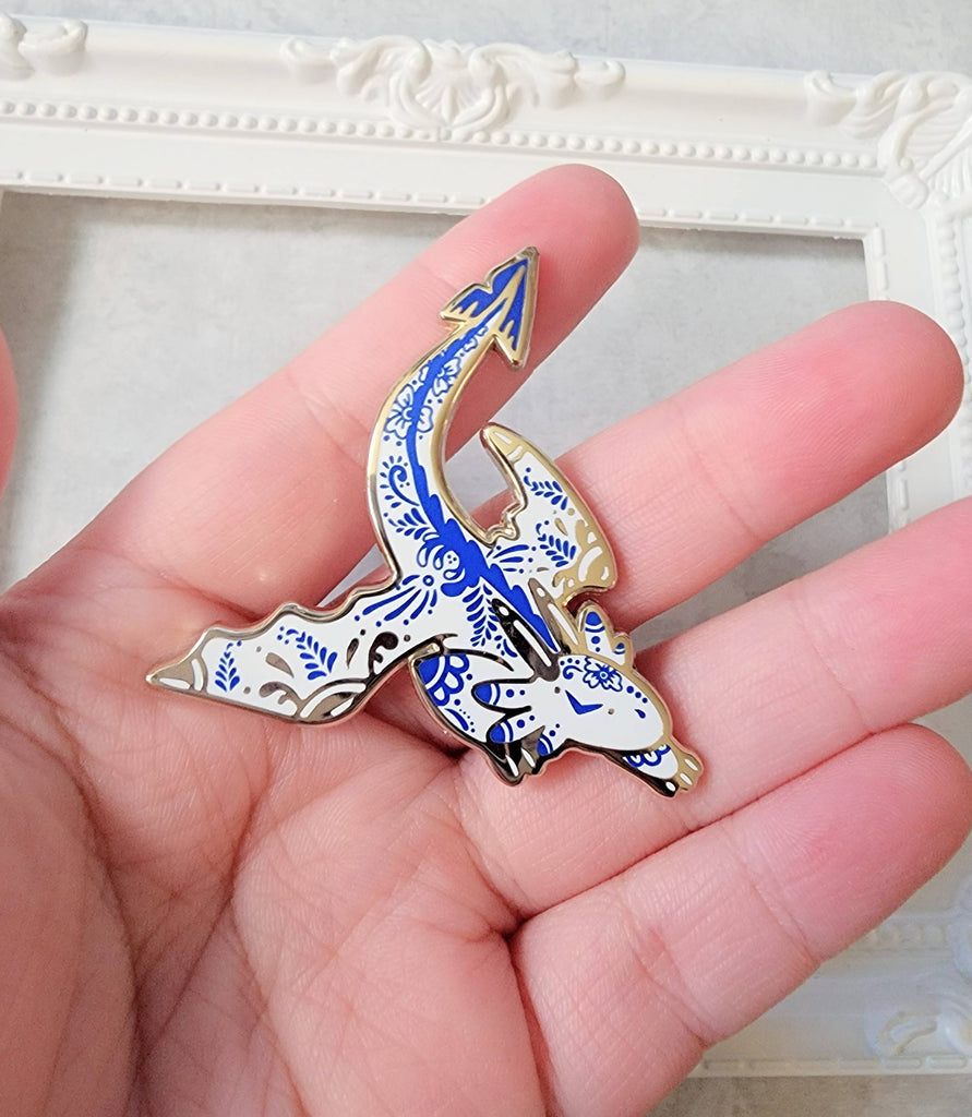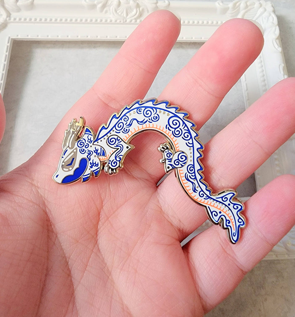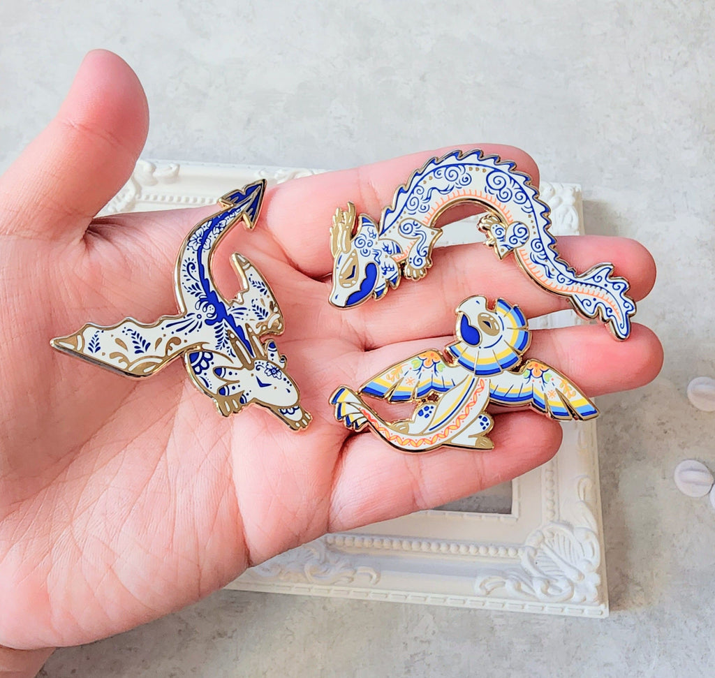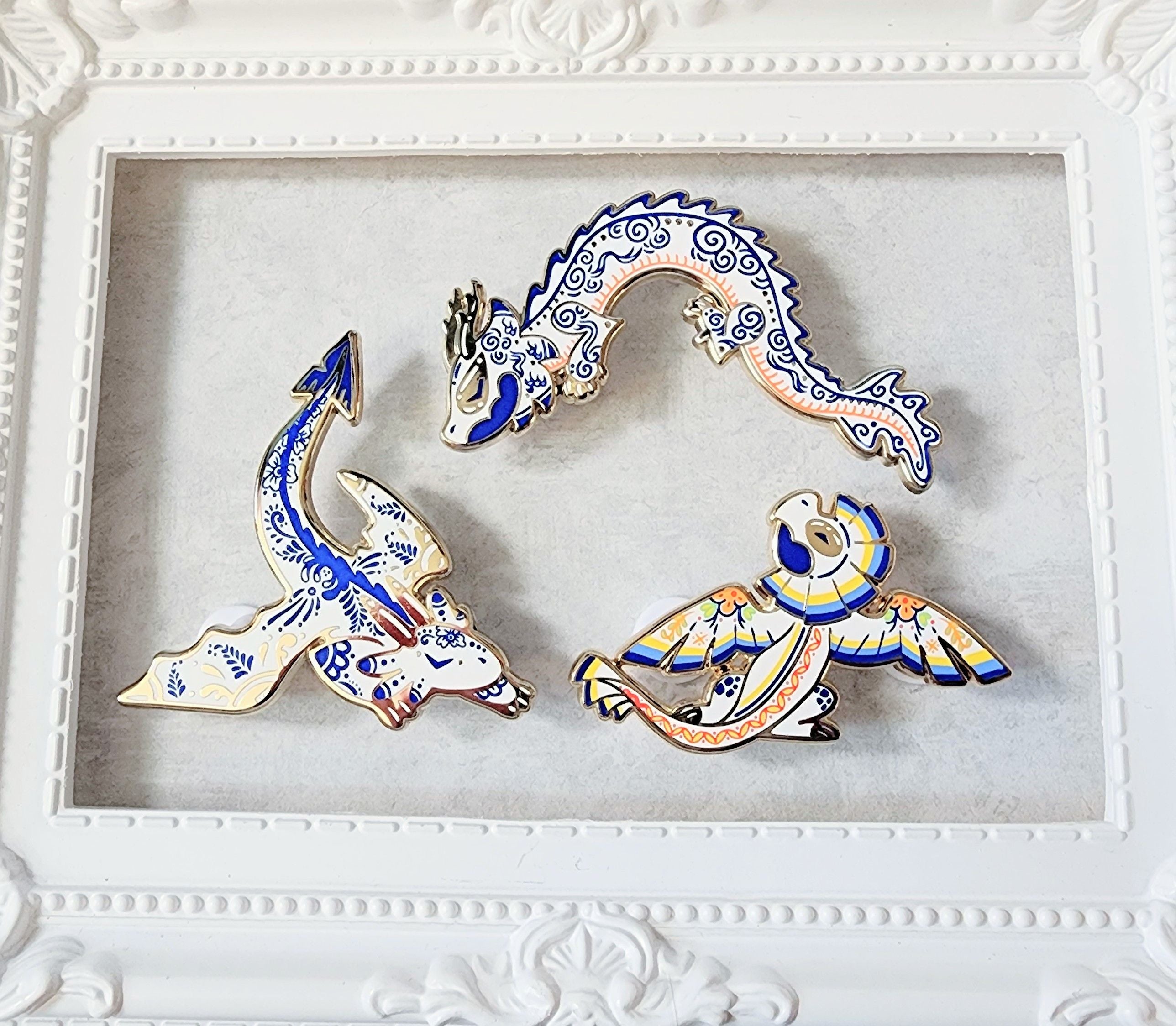2-2.3 inch hard gold enamel pins of my Porcelain Dragons series. Each dragon is based on a regional porcelain design. Comes with 2 rubber backings. Grab the set of three for a small discount!